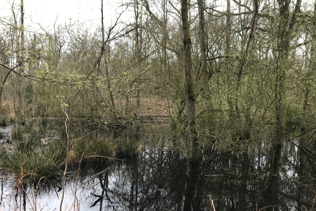 Er er zijn ook bomen in het water. Met daar verderop een eiland waar niemand die droge voeten wil houden kan bijkomen. We zien er wel herten. En ik dacht deze ochtend dat dit typisch zo een plek is waar je als kind van droomt ook te kunnen gaan staan. Ver weg van je ouders, omdat jij wel laarsen aan hebt en het durft daar heen te lopen.